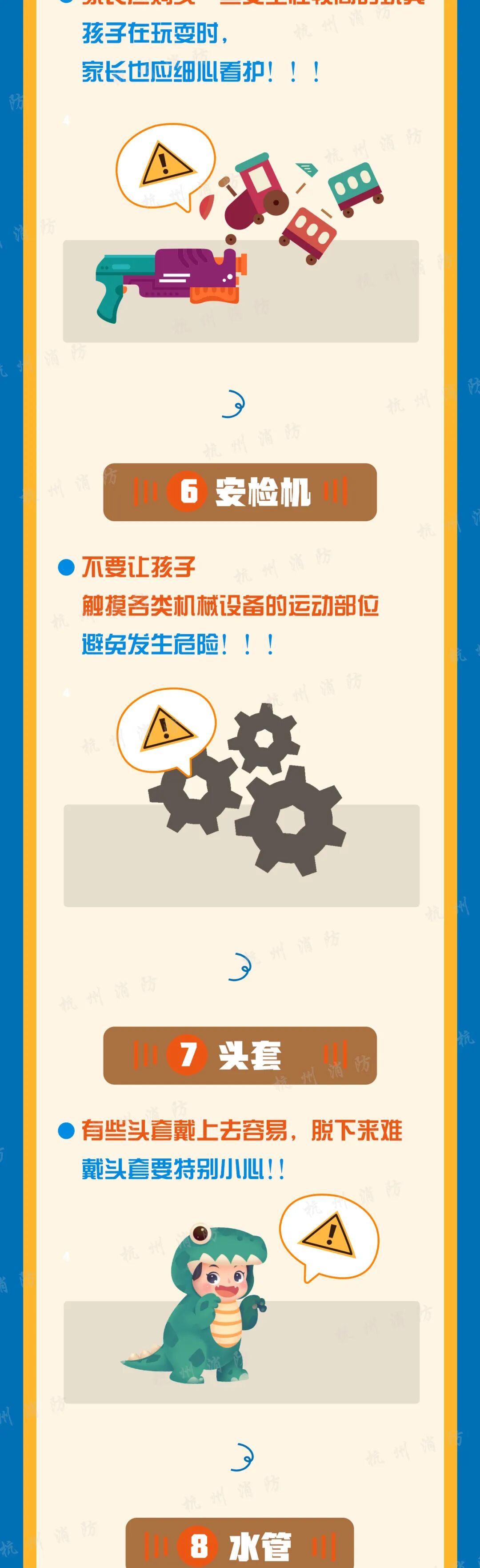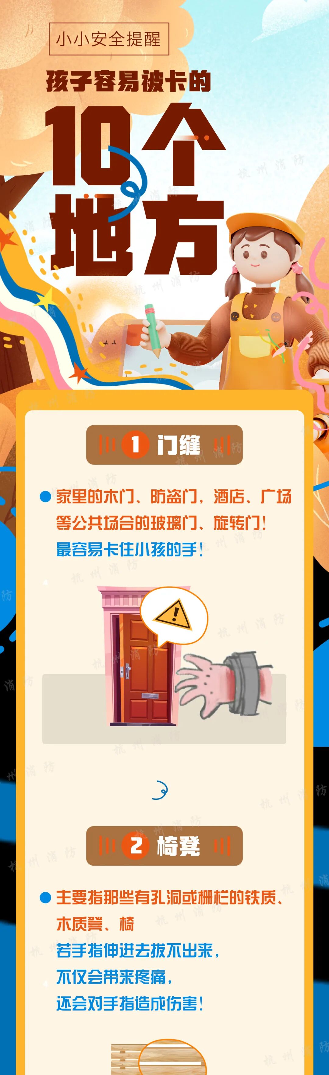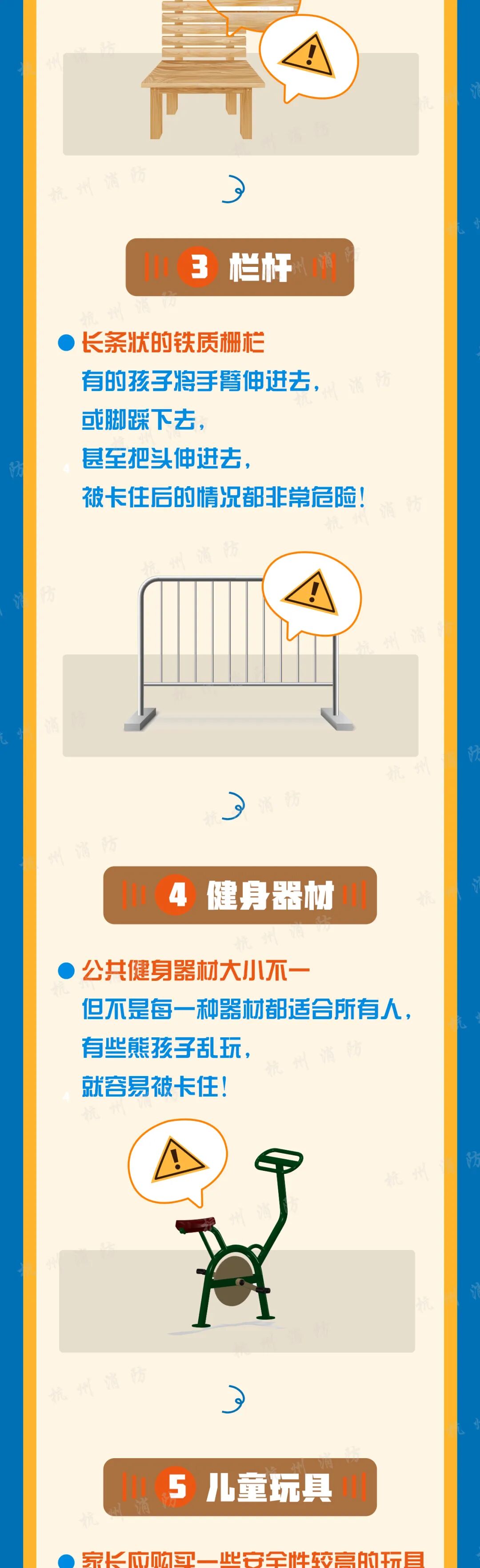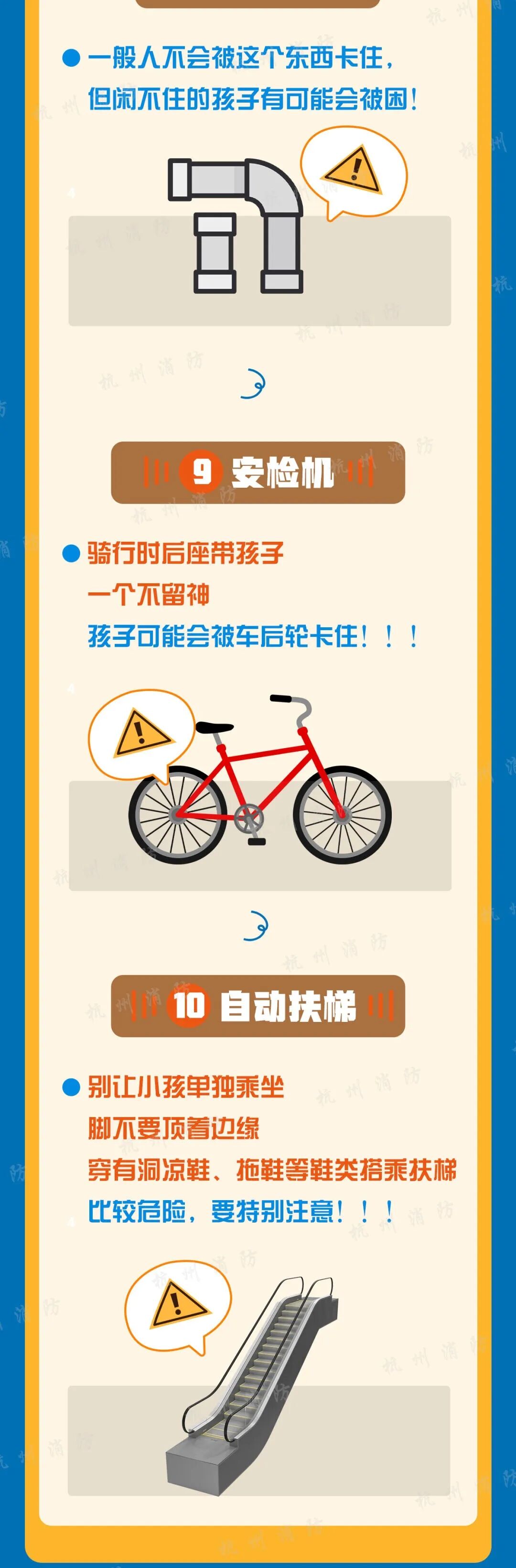 01 #脚卡旋转门# 6月30日,河南许昌一宾馆内 一名6岁男童的脚 被卡在了旋转门中 救援人员使用液压扩张器 插入旋转门的两扇门之间 还要防止旋转门玻璃 受力变形后破碎伤及男童 02 #腿卡座椅缝隙# 7月4日,河南焦作一医院内 一男婴左腿部 卡在医院公共座椅的缝隙中 消防员一边安抚男婴情绪 一边使用液压破拆装置 撑开座椅缝隙开展救援 03 #手卡电动扶梯# 7月4日,河南周口一商场内 一5岁男童在电梯上玩耍时 将手伸进电动扶梯内侧缝隙内 导致右手被卡无法拔出 经过15分钟的紧张救援,男孩被救出 送以后诊断两根手指轻微骨折 04 #手卡钢圈# 7月4日凌晨,河南焦作, 一女士带孩子来到当地消防队求助 称孩子右手食指被一枚钢圈卡住 无法取下,肿胀疼痛 消防员使用缘剪断钳多段剪的方式进行剪切 十分钟后,铁圈终于被一点点剪开 05 #手卡压面机# 以下视频来源于 洛阳消防 7月3日,河南洛阳 一名3岁小女孩手指被压面机死死卡住 手指已有鲜血渗出 小女孩因手指疼痛不停哭喊 消防员利用食用油对被卡处实施润滑 经过10分钟的紧张救援 小女孩的手指成功脱困 06 #脚卡健身器材# 如果孩子不慎被东西卡住,一定不要生拉硬拽,盲目施救。若救援方式不对,很容易让孩子造成二次伤害。若手指、脚趾部位被卡住,可以尝试用肥皂水或润滑油拔出。若处理不了,应及时拨打119报警电话求助。 孩子安全无小事! 广大家长要时刻警惕! 祝所有小朋友都能 平安愉快地度过假期! 来源:综合河南消防、洛阳消防、 鹤壁消防、焦作消防、许昌消防、周口消防
