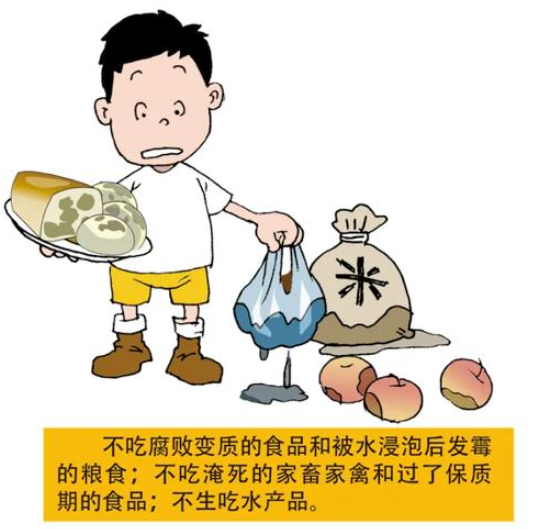 2、注意饮食卫生。食物要煮熟煮透后食用,不吃被洪水浸泡过的食物或腐败变质的食品,不吃淹死的家禽家畜,餐具要清洁或消毒后使用,不使用污水洗瓜果、碗筷,不进食生的海产品。图源:网络