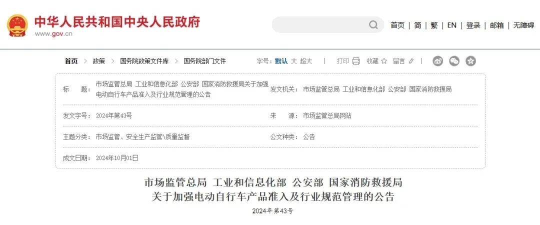 现行的电动自行车安全强制性国家标准包括GB 17761—2018《电动自行车安全技术规范》、GB 42295—2022《电动自行车电气安全要求》、GB 42296—2022《电动自行车用充电器安全技术要求》、GB 43854—2024《电动自行车用锂离子蓄电池安全技术规范》等。GB 42295—2022《电动自行车电气安全要求》第1号修改单、GB 42296—2022《电动自行车用充电器安全技术要求》第1号修改单、GB 43854—2024《电动自行车用锂离子蓄电池安全技术规范》将于2024年11月1日起实施。根据《中华人民共和国标准化法》第二十五条规定,自2024年11月1日起,不符合GB 42295—2022《电动自行车电气安全要求》及第1号修改单要求的电动自行车、装配充电器不符合GB 42296—2022《电动自行车用充电器安全技术要求》及第1号修改单的电动自行车、装配锂离子蓄电池不符合GB 43854—2024《电动自行车用锂离子蓄电池安全技术规范》的电动自行车不得生产、销售、进口。市场监管总局将前述4项强制性国家标准及修改单,作为电动自行车强制性产品认证依据标准。根据《中华人民共和国认证认可条例》第二十七条,自2024年11月1日起,对新提出认证委托的电动自行车,应符合前述强制性国家标准及修改单要求,经过认证并标注认证标志后,方可出厂、销售、进口或者在其他经营活动中使用。认证委托人可自愿提前实施。电动自行车强制性产品认证各指定认证机构应当严格依据前述4项强制性国家标准及修改单对电动自行车实施认证,及时修订完善认证实施规则,控制并验证获证产品与型式试验样品的一致性、生产企业的质量保证能力持续符合认证要求,对获证产品加大市场抽样检测或者检查力度,保证认证结论客观、真实并承担相应法律责任。认证委托人对其已获得强制性产品认证的电动自行车,应在2024年10月31日前符合前述4项强制性国家标准及修改单要求并完成认证变更。逾期未完成认证变更的,指定认证机构对认证证书作出暂停处理,暂停期不超过3个月。认证委托人在2024年10月31日前主动提出暂停认证证书的,暂停期可延长至1年。暂停期内完成认证变更的,恢复认证证书有效;暂停期满仍不能完成认证变更的,撤销认证证书。根据《强制性产品认证管理规定》第二十九条,获证产品被注销、暂停或者撤销认证证书的,认证机构应当确定不符合认证要求的产品类别和范围。自认证证书注销、撤销之日起或者认证证书暂停期间,不符合认证要求的产品,不得继续出厂、销售、进口或者在其他经营活动中使用。各地市场监管部门依据《中华人民共和国产品质量法》《中华人民共和国标准化法》《中华人民共和国认证认可条例》等法律法规,督促电动自行车生产销售单位全面落实质量安全主体责任,在生产、流通环节加强电动自行车产品质量监督检查,依法查处违法行为。聚焦认证质量,持续加强电动自行车认证活动、认证结果日常监督管理,督促认证机构及其认证人员对认证结果负责,依法查处违规认证机构、实验室。各地公安机关交管部门强化电动自行车登记上牌管理,严格核验销售发票、产品合格证和强制性产品认证证书等。2024年11月1日起,对2024年10月31日前销售的、因未完成认证变更而暂停认证证书的电动自行车可办理登记上牌;对2024年11月1日后销售的、不具有有效认证证书的电动自行车不予办理登记上牌,并将有关线索及时移送同级市场监管部门。各地工业和信息化主管部门加强对电动自行车行业的管理,会同同级市场监管、消防等部门指导企业按照《电动自行车行业规范条件》要求,加快技术改造,规范各项管理,推动标准、认证的贯彻落实;做好本地区电动自行车企业规范公告申请的受理、核实和报送工作,监督检查本地区已进入公告名单企业《电动自行车行业规范条件》执行情况。对不能保持《电动自行车行业规范条件》要求的电动自行车企业,拒不整改或整改不合格的,工业和信息化部将其从公告名单中撤销。各地电动自行车安全隐患全链条整治工作专班和有关部门要加强组织协调,压实各方责任,强化工作联动,切实提升电动自行车质量安全水平。