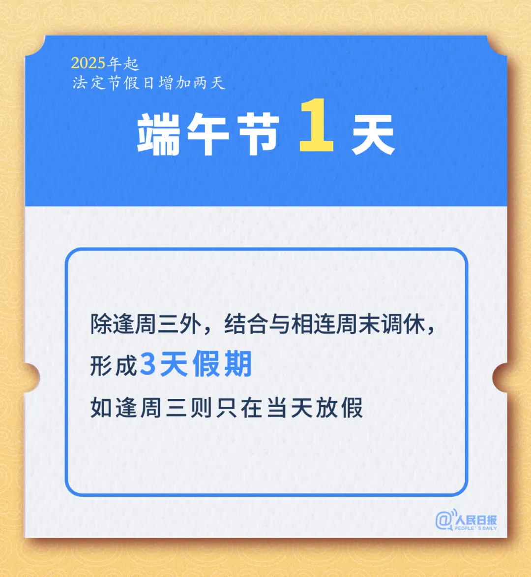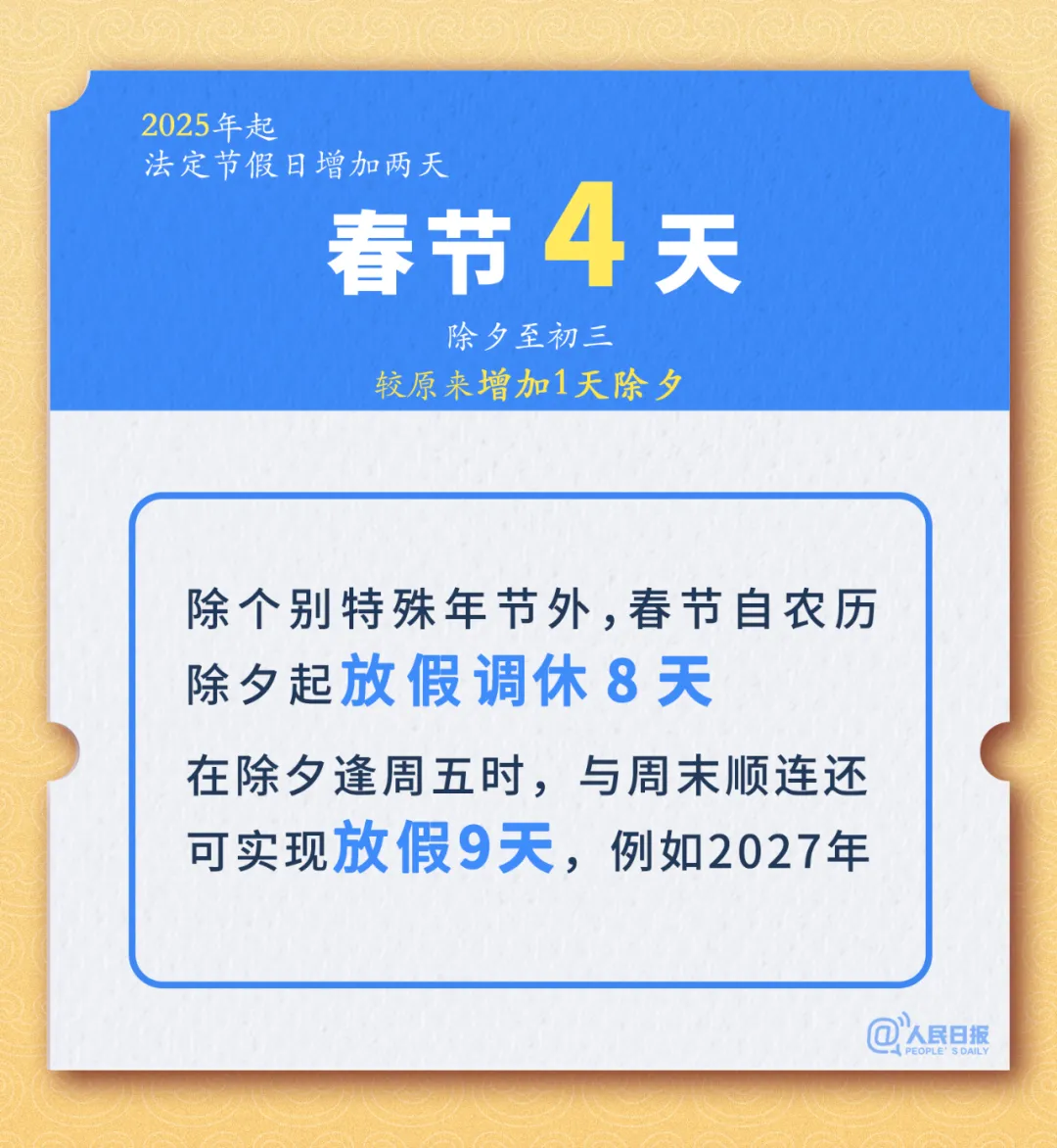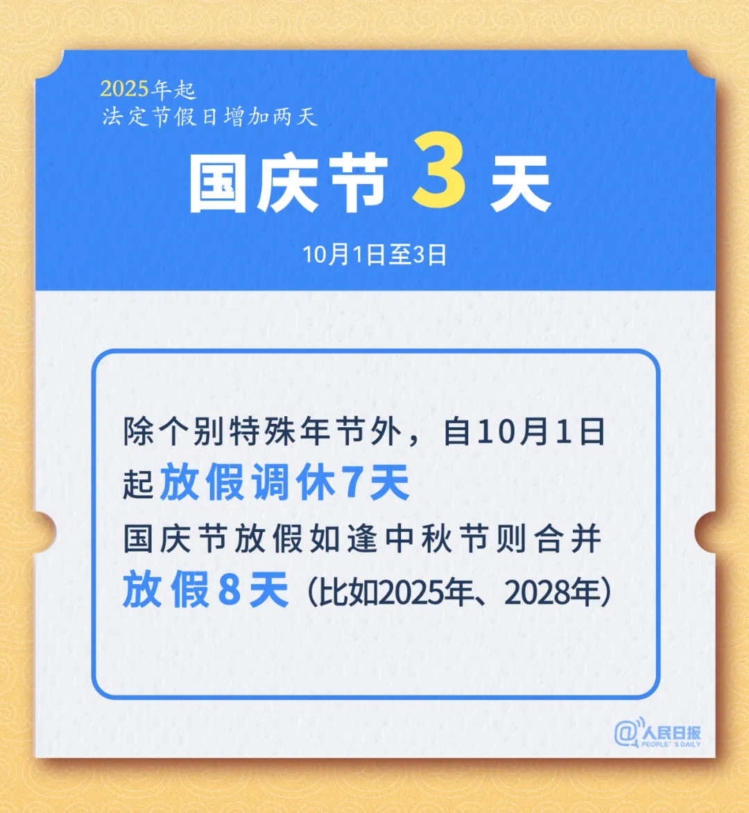 12日,国务院公布《关于修改<全国年节及纪念日放假办法>的决定》(以下简称《办法》),自2025年1月1日起施行,同时公布2025年部分节假日安排。《办法》修改前,我国全体公民放假的节日是7个,共放假11天。此次修改后,7个节日共放假13天。具体要点如下:春节4天(除夕至初三),通过调休放假至少8天,较原来增加1天;国庆节3天(10月1日至3日),调休形成7天假期;劳动节2天(5月1日、2日),调休放假5天,较原来少调休1天;元旦、清明节、端午节、中秋节各1天,除逢周三外,结合与相连周末调休,形成3天假期。