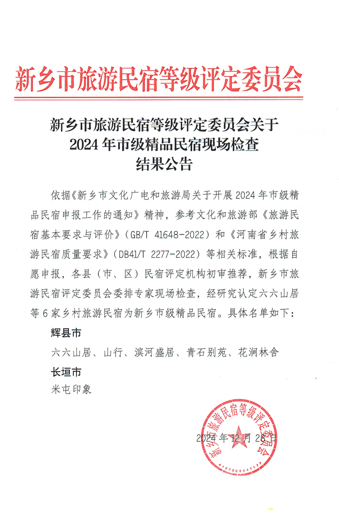 12月28日,新乡市旅游民宿等级评定委员会公布了2024年度新乡市旅游民宿等级评定结果。长垣市1家民宿榜上有名,米屯印象民宿。来源:网络