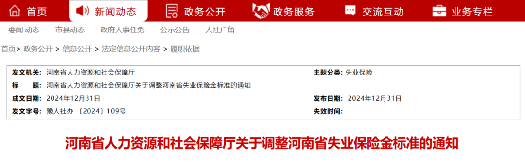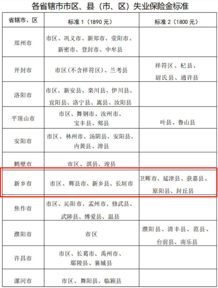今年3月起 河南省失业保险金标准将上调 一起来看看吧! ↓ ↓ ↓ PART.01 3月起 河南省失业保险金标准将上调 图源:河南省人力资源和社会保障厅 失业保险金基本标准按照全省一类行政区域最低工资标准的百分之九十确定,调整为1890元/月。 其中,失业保险金基本标准高于最低工资标准的三类行政区域,失业保险金标准按照不高于所在地最低工资标准确定,调整为1800元/月。 纳入省直统筹的失业保险参保单位失业保险金标准,参照郑州市市区标准执行。 调整后的失业保险金标准从2025年3月1日起施行。 正在领取失业保险金人员的发放标准,按照调整后的失业保险金标准执行。根据相关规定补发的失业保险金,按照补发月份对应的失业保险金标准执行。 (上下滑动查看) 河南省人力资源和社会保障厅 关于调整河南省失业保险金标准的通知 各省辖市、济源示范区人力资源社会保障局: 根据河南省第十四届人民代表大会常务委员会第十二次会议审议通过的《河南省失业保险条例》,按照《河南省人民政府关于调整河南省最低工资标准的通知》(豫政〔2023〕43号)明确的全省各类行政区域最低工资标准,决定对我省现行失业保险金标准进行调整,请认真贯彻执行。 一、确定失业保险金标准 失业保险金基本标准按照全省一类行政区域最低工资标准的百分之九十确定,调整为1890元/月。其中,失业保险金基本标准高于最低工资标准的三类行政区域,失业保险金标准按照不高于所在地最低工资标准确定,调整为1800元/月。纳入省直统筹的失业保险参保单位失业保险金标准,参照郑州市市区标准执行。 二、明确有关问题 (一)调整后的失业保险金标准从2025年3月1日起施行。正在领取失业保险金人员的发放标准,按照调整后的失业保险金标准执行。根据相关规定补发的失业保险金,按照补发月份对应的失业保险金标准执行。调整标准所需资金由失业保险基金列支。 (二)符合领取失业保险金条件的失业人员,可在最后参保地申领失业保险金,也可以选择回户籍地申领,发放标准按照申领地失业保险金标准执行。需办理失业保险关系跨省转移的,社会保险经办机构要按规定为其办理。 (三)失业人员领取失业保险金期间因重新就业而停止领取失业保险金的,其剩余领取期限应当予以保留,可以与重新就业后缴费时间所核算的领取期限合并计算,再次失业时,按照现行失业保险金标准审核发放。 (四)失业人员在领取失业保险金期间被判刑收监执行的,中断领取失业保险金,其失业保险金领取期限中断计算。中断情形消除后,失业人员可以继续申领失业保险金,失业保险金标准按照现行标准执行。 三、工作要求 各地要高度重视失业保险金标准调整工作,全面落实失业保险待遇“畅通领、安全办”工作要求,做到工作不断档、申领不扎堆,及时满足失业人员申领需求,确保失业保险金及其他失业保险待遇按时足额发放,切实维护失业人员领取失业保险待遇的权益。 附件:各省辖市市区、县(市、区)失业保险金标准 2024年12月31日 来源:河南省人力资源和社会保障厅 https://hrss.henan.gov.cn/2024/12-31/3106660.html PART.02 河南省各地失业保险金标准 (调整后) 图源:河南省人力资源和社会保障厅(下同) 关于失业保险金 还有这些问题 ↓ ↓ ↓ 符合申领条件的申请人,在成功办理失业保险金申领手续和办理失业登记后,失业保险金于次月起发放至个人银行账户。 (1)劳动合同期满或用人单位主体资格消亡终止劳动合同; (2)用人单位因生产经营发生严重困难、客观条件发生重大变化等原因解除劳动合同; (3)用人单位因劳动者违纪、违反规章制度等原因,或虽无过错但不能胜任工作而解除劳动合同; (4)协商一致解除劳动合同; (5)因用人单位欠薪欠保等违法行为导致劳动者主动解除劳动合同; (6)法律、法规、规章规定的其他情形。 注:据此,因公司拖欠工资、不缴纳社会保险原因离职,属于非因本人意愿中断就业,可以申领失业保险金。 不可以。失业人员领取失业保险金的期限,根据失业人员累计缴纳失业保险费的时间,按下列规定核定: 累计缴费时间满1年不足5年的,每满1年领取3个月的失业保险金,领取期限最长为12个月。 累计缴费时间满5年不足10年的,每满1年增领2个月的失业保险金,领取期限最长为18个月。 累计缴费时间10年以上的,每满1年增领1个月的失业保险金,领取期限最长为24个月。 《人力资源社会保障部办公厅关于进一步推进失业保险金“畅通领、安全办”的通知》规定:“不得以超过60日申领期限为由拒发失业保险金。” 根据上述规定,失业后申领失业保险金没有时间限制。只要失业人员和单位共同缴纳失业保险费满1年且属于非因本人意愿中断就业,可以申领失业保险金。 失业人员在领取失业保险金期间重新就业后再次失业的,缴费时间重新计算,其领取失业保险金的期限可以与前次失业应领取而尚未领取的失业保险金的期限合并计算,但是最长不得超过24个月。 失业人员在领取失业保险金期间重新就业后不满1年再次失业的,可以继续由领其前次失业应领取而尚未领取的失业保险金。 符合失业保险金申请条件的 小伙伴 赶紧申领起来吧 在找到心仪的工作前 也能多一笔收入了~ 还有以下这些好处 可别忘记了 1.失业人员在领取失业保险金期间,同时享受代缴职工基本医疗保险费(含生育保险费)