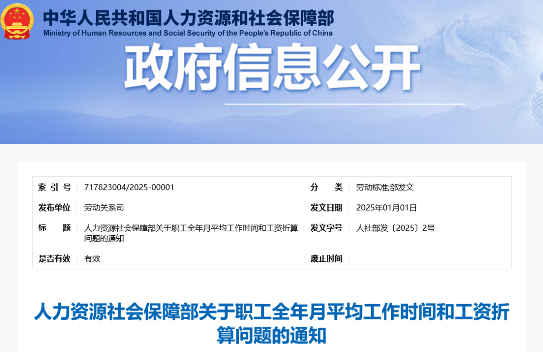1月1日,人力资源和社会保障部发布《关于职工全年月平均工作时间和工资折算问题的通知》,公布了最新的职工全年月平均制度工作时间和工资折算办法。