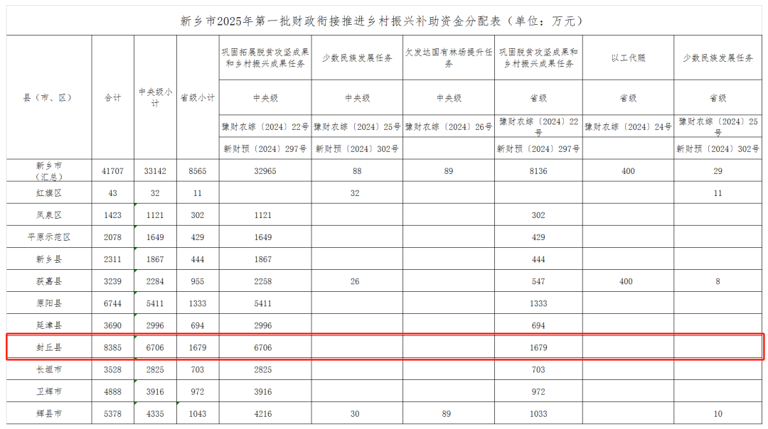 根据财政资金管理有关规定,现将下达2025年第一批财政衔接推进乡村振兴补助资金分配情况公示如下:豫财农综〔2024〕22号分别下达中央级、省级财政衔接推进乡村振兴补助资金(巩固脱贫攻坚成果和乡村振兴任务)30195万元、7405万元;豫财农综〔2024〕24号下达省级财政衔接推进乡村振兴补助资金(以工代赈任务)400万元;豫财农综〔2024〕25号分别下达中央级、省级财政衔接推进乡村振兴补助资金(少数民族发展任务)56万元、18万元;豫财农综〔2024〕26号下达中央级财政衔接推进乡村振兴补助资金(少欠发达国有林场提升任务)89万元;新财预〔2024〕297号下达中央财政衔接推进乡村振兴补助资金(巩固脱贫攻坚成果和乡村振兴任务)2770万元、731万元;新财预〔2024〕302号分别下达中央级、省级财政衔接推进乡村振兴补助资金(少数民族发展任务)32万元、11万元。豫财农综〔2024〕22号、豫财农综〔2024〕24号豫财农综〔2024〕25号、豫财农综〔2024〕26号中央级、省级财政衔接推进乡村振兴补助资金由省直接分配至相关县(市)。新财预〔2024〕297号、302号下达相关市辖区财政衔接推进乡村振兴补助资金分别由市农业农村局、市民族宗教局按照有关因素进行分配。