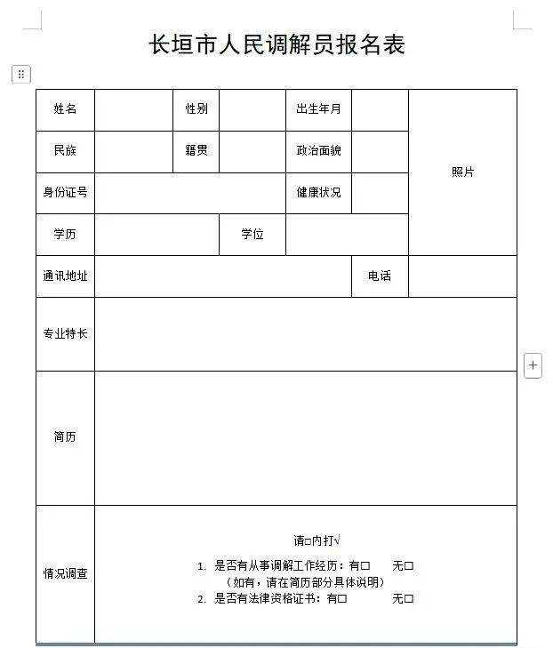 为坚持和发展新时代“枫桥经验”,优化我市人民调解员队伍,提升矛盾纠纷排查化解质效,结合我市调解工作实际,现面向社会公开选任人民调解员: 一、选任岗位 长垣市人民调解员 二、岗位职责 开展我市人民调解工作 三、报名条件 1.年龄范围原则上35-68周岁; 2.拥护党的领导,热爱人民调解工作。身体健康,具有履行职责的身体条件和工作能力; 3.老党员、老干部、老政法干警、老教师、老知识分子等“五老乡贤”,或在行业领域具有丰富经验的人员,可以优先选用; 4.未曾受过刑事处罚,没有违反其他法律规定的行为。 四、报名时间及其他要求 (一)报名时间: 2025年1月6日至2025年1月24日。 (二)报名方式:1.电话报名:张利15736962652、8885011;2.报名者可通过电子邮件形式发送报名表(见附件),地址:长垣市华垣路中段公共法律服务中心;邮箱:hncysfj@163.com。 (三)待遇:1.人民调解员调解成功的案件依据《长垣市调解案件管理办法》可享受我市调解案件补贴。 2.成功调解案件较多的调解员优先选入我市专职人民调解员队伍。 长垣市人民调解协会 2025年1月6日