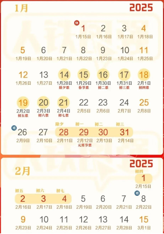 注意! 春节前一周要上6天班 其中周日(1月26日)要上班 春节假期 从1月28日持续到2月4日,共8天 节后的周六(2月8日)要上班 注意合理安排时间~ 春节假期 高速公路小客车免费通行 铁路春运购票日历 1月17日,河南省公安厅联合省交通运输厅,召开集中约谈曝光会。记者了解到,春运特别是春节期间,全省交管部门对轻微交通违法以教育警告为主,体现交管执法的“温度”。 据介绍,2024年河南公安交管工作保持了积极向好的发展态势,取得了“三个明显下降”的成效。第一个明显下降是交通事故总量,同比下降14.08%,第二个明显下降是交通事故亡人数,同比下降14.52%,第三个明显下降是较大事故数量,同比下降50%,重大以上交通事故零发生,有力保障了人民群众生命财产安全,积极服务了全省经济社会发展大局。 春运期间,全省交警将重心向节前返乡、节后返岗、春节、元宵节等重要节点倾斜,将警力向景区、商圈、机场、车站等人员密集场所集中,将装备向公路桥隧、临水临崖、急弯陡坡、易发雨雾、易积雪结冰等风险路段投放,将执法重点向酒驾醉驾、超员超载、疲劳驾驶等严重交通违法聚焦,努力为群众欢度春节创造良好的道路交通环境。 同时把服务放在执法前,先服务再执法,对轻微交通违法以教育警告为主,体现交管执法的“温度”。将交警执法站、执勤点,变成一个个便民驿站,配备热水、食品、药品等基础物资,为过往群众提供暖心服务。 曝光会上还通报了近期5起典型事故案例,10名终生禁驾人员,9辆交通违法未处理较多的大中型客车,10辆交通违法未处理较多的重中型货车,10辆交通违法未处理较多的危化品运输车,10辆交通违法未处理较多的小型汽车,4个亡人事故多发路段,5家预约出租客运事故多发公司,35家道路运输领域隐患突出企业。 来源:大河报、中国政府网、人民日报客户端河南:春节期间轻微交通违法不处罚