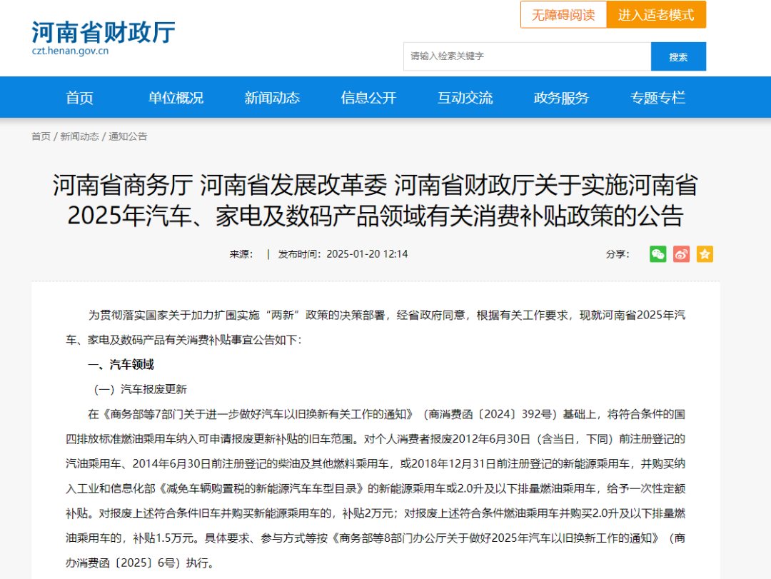1月20日,记者从省商务厅获悉,为贯彻落实国家关于加力扩围实施“两新”政策的决策部署,经省政府同意,根据有关工作要求,河南省商务厅、河南省发展改革委以及河南省财政厅联合发布关于实施河南省2025年汽车、家电及数码产品领域有关消费补贴政策的公告。 具体公告内容如下: 一 汽车领域 (一)汽车报废更新 在《商务部等7部门关于进一步做好汽车以旧换新有关工作的通知》(商消费函〔2024〕392号)基础上,将符合条件的国四排放标准燃油乘用车纳入可申请报废更新补贴的旧车范围。对个人消费者报废2012年6月30日(含当日,下同)前注册登记的汽油乘用车、2014年6月30日前注册登记的柴油及其他燃料乘用车,或2018年12月31日前注册登记的新能源乘用车,并购买纳入工业和信息化部《减免车辆购置税的新能源汽车车型目录》的新能源乘用车或2.0升及以下排量燃油乘用车,给予一次性定额补贴。对报废上述符合条件旧车并购买新能源乘用车的,补贴2万元;对报废上述符合条件燃油乘用车并购买2.0升及以下排量燃油乘用车的,补贴1.5万元。具体要求、参与方式等按《商务部等8部门办公厅关于做好2025年汽车以旧换新工作的通知》(商办消费函〔2025〕6号)执行。 (二)汽车置换更新 自2025年1月1日起,对个人消费者在省内转让(不含变更登记和报废)本人名下乘用车,并在省内购买、登记上牌乘用车新车的,给予一次性补贴。其中,购车价格6万元(含,购车发票价,下同)至10万元(不含,下同)的新能源乘用车补贴1万元、燃油乘用车补贴7000元;购车价格10万元至20万元的新能源乘用车补贴1.4万元、燃油乘用车补贴1万元;购车价格20万元及以上的新能源乘用车补贴1.5万元、燃油乘用车补贴1.3万元。 转让的旧乘用车应当于2025年1月8日前登记在申请人名下。每名消费者在一个自然年度内最多可享受一次汽车置换更新补贴,同一辆新乘用车不能同时申请汽车报废更新补贴。 消费者可参照《河南省商务厅等8部门关于印发<河南省汽车置换更新补贴实施细则>的通知》(豫商运〔2024〕34号)明确的条件要求,留存相关证明材料,待2025年汽车置换补贴申报系统上线后,按照先到先得、用完为止的原则提报申请资料。 二 家电及数码产品领域 (一)家电产品 自本公告发布之日起,个人消费者在参与商家购买冰箱(含冰柜)、洗衣机(含洗烘一体机)、电视(含激光电视,不含投影仪)、空调(含家用中央空调)、电脑(品牌机,不含组装机)、热水器(含壁挂炉)、家用灶具(含集成灶)、吸油烟机、净水器(含直饮机、管线机)、微波炉(含微蒸烤一体机)、洗碗机、电饭煲(锅)等12类家电产品,对2级能效或水效标准产品按最终销售价格的15%给予补贴,对1级能效或水效标准产品按最终销售价格的20%给予补贴。每位消费者每类产品可补贴1件(空调产品最多可补贴3件),每件补贴不超过2000元。2024年已享受某类家电产品以旧换新补贴的个人消费者,2025年购买同类家电产品可继续享受补贴。 (二)数码产品 自本公告发布之日起,个人消费者在参与商家购买补贴范围内手机、平板、智能手表(手环)等3类(单件销售价格不超过6000元)数码产品的,按产品最终销售价格的15%给予补贴,每位消费者每类产品可补贴1件,每件补贴最高不超过500元。 (三)参与方式 消费者通过云闪付APP搜索“河南省消费品以旧换新服务平台”小程序,登录“家电数码补贴专区”,填报个人基本信息,完成实名认证,领取相应补贴券,到参与商家购买补贴范围内的产品,每件单独支付结算,直接享受支付立减。补贴券当日有效,如未核销使用可再次领取。 消费者需向商家提供送货安装(商品使用)地址、商品SN码、IMEI码、实物图片等必要信息,电脑、手机、平板、智能手表(手环)等商品需现场开机或激活。 三 有关要求 各地要按照全省工作要求,引导市场主体诚信经营,公开承诺产品销售价格,发现存在不履行价格承诺、先涨价后打折、恶意低价等违法违规行为的,要第一时间取消其参与活动资格,追缴国家补贴资金,依法依规严肃处理。要统筹好“新家电购买补贴”与“废旧家电回收处置”的关系,优先支持具有废旧家电回收能力、主动提供回收服务的主体参与以旧换新政策,多措并举便利消费者换新交旧。要依托本地12345政务服务便民热线等建立咨询服务专线,及时回应社会关切。 本公告有关事宜,若国家有最新要求和河南省有关方案细则出台,按最新政策要求执行。 ▌来源:河南省财政厅、郑州日报、开封网