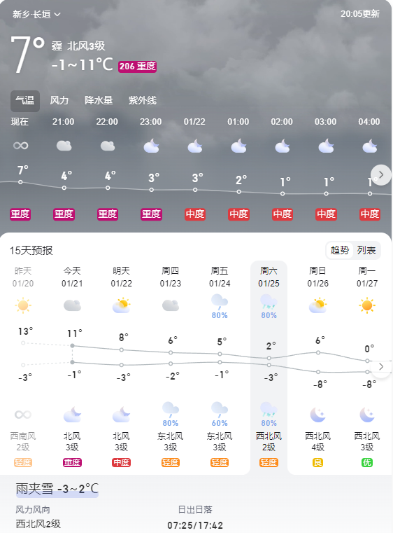 虽然近期晴朗常驻, 适宜返乡出行, 但一波雨雪和冷空气 已“整装待发”。 预计22日夜里到23日, 沿黄及以南地区 有小雨或零星小雨, 高海拔山区有雨夹雪或小雪。 24日,全省阴天有小到中雨,其中西部、北部转雨夹雪或小到中雪,高海拔山区大到暴雪。25日,西部、北部有小到中雪、局部大到暴雪,东部、东南部有小到中雨,其他县市小雨转雨夹雪或中到大雪。26日,东部、东南部雨夹雪或小雪逐渐停止转阴天。 全省大部将达到寒潮标准 明后两天,全省东北风3级到4级,阵风5级到6级,24日到26日,有一次强冷空气影响河南。24日,全省偏北风4级左右,阵风6级左右,25日至26日,全省偏北风5级左右,阵风7级到8级,局部9级左右。 由于前期气温处于较高水平,在雨雪和寒风的双重“攻击”下,气温将明显下降。24日,西部、北部最高气温普遍降至5℃以下。预计27日到28日,凌晨全省大部最低气温将不足-10℃,西部、北部局地甚至低于-15℃。过程最大48小时降温幅度超过10℃,西部、北部将超过12℃。 未来7天天气预报 今天下午到夜里,全省晴天间多云。 明天,全省多云转阴天。全省东北风3级到4级,阵风5级到6级。 22日白天,西南部、南部阴天;其他县市阴天转多云。全省东北风3级到4级,阵风5级到6级。 22日夜里到23日,全省多云到阴天,沿黄及以南地区有小雨或零星小雨,高海拔山区有雨夹雪或小雪。 24日,全省阴天有小到中雨,其中西部、北部转雨夹雪或小到中雪,高海拔山区大到暴雪。全省偏北风4级左右,阵风6级左右。 25日,全省阴天,西部、北部有小到中雪、局部大到暴雪;东部、东南部有小到中雨;其他县市小雨转雨夹雪或中到大雪。 26日,东部、东南部雨夹雪或小雪逐渐停止转阴天,其他县市阴天到多云。 受冷空气影响,25日至26日,全省偏北风5级左右,阵风7级到8级,局部9级左右。 长垣最新天气预报 丨内容来源:大河报、中国天气网