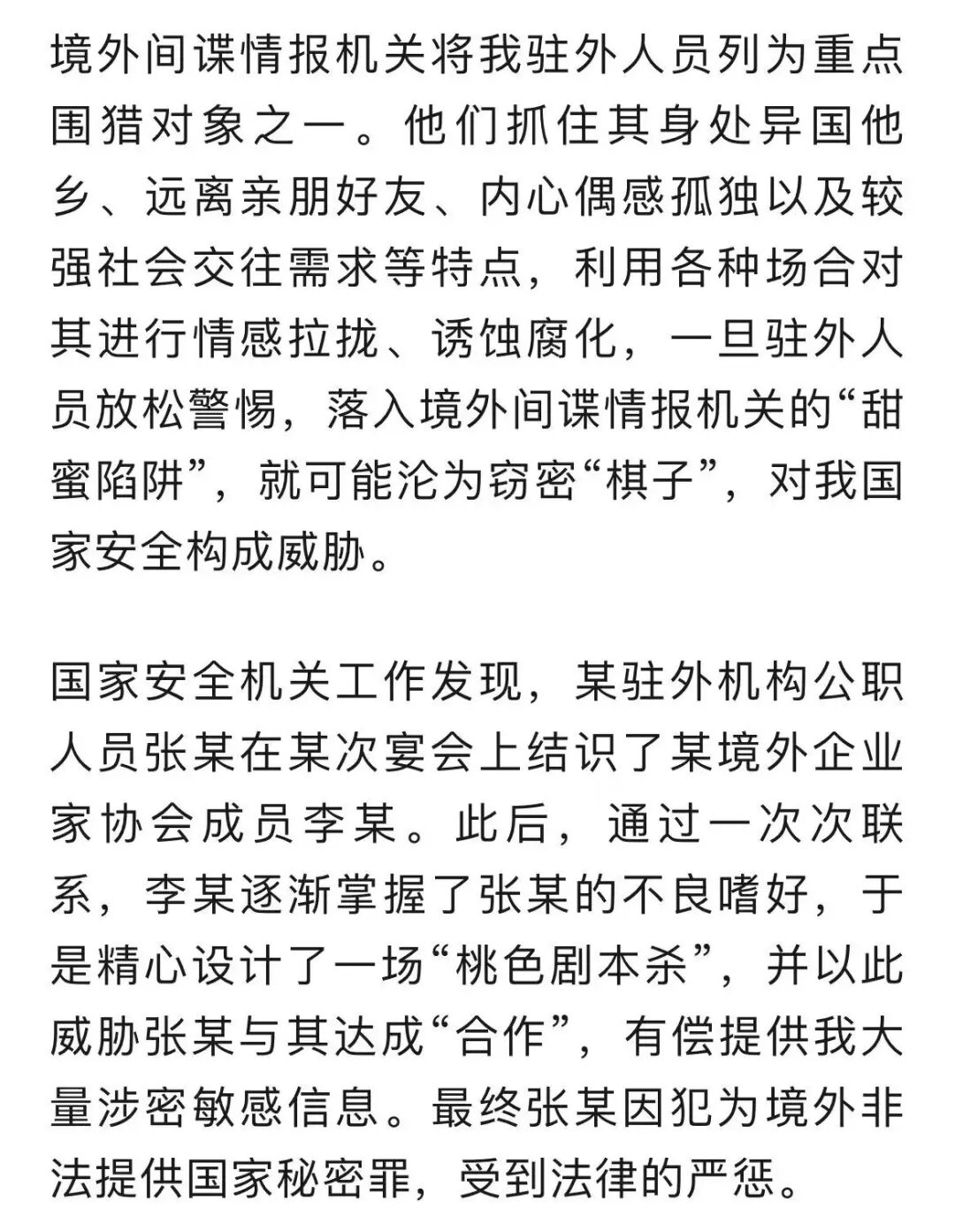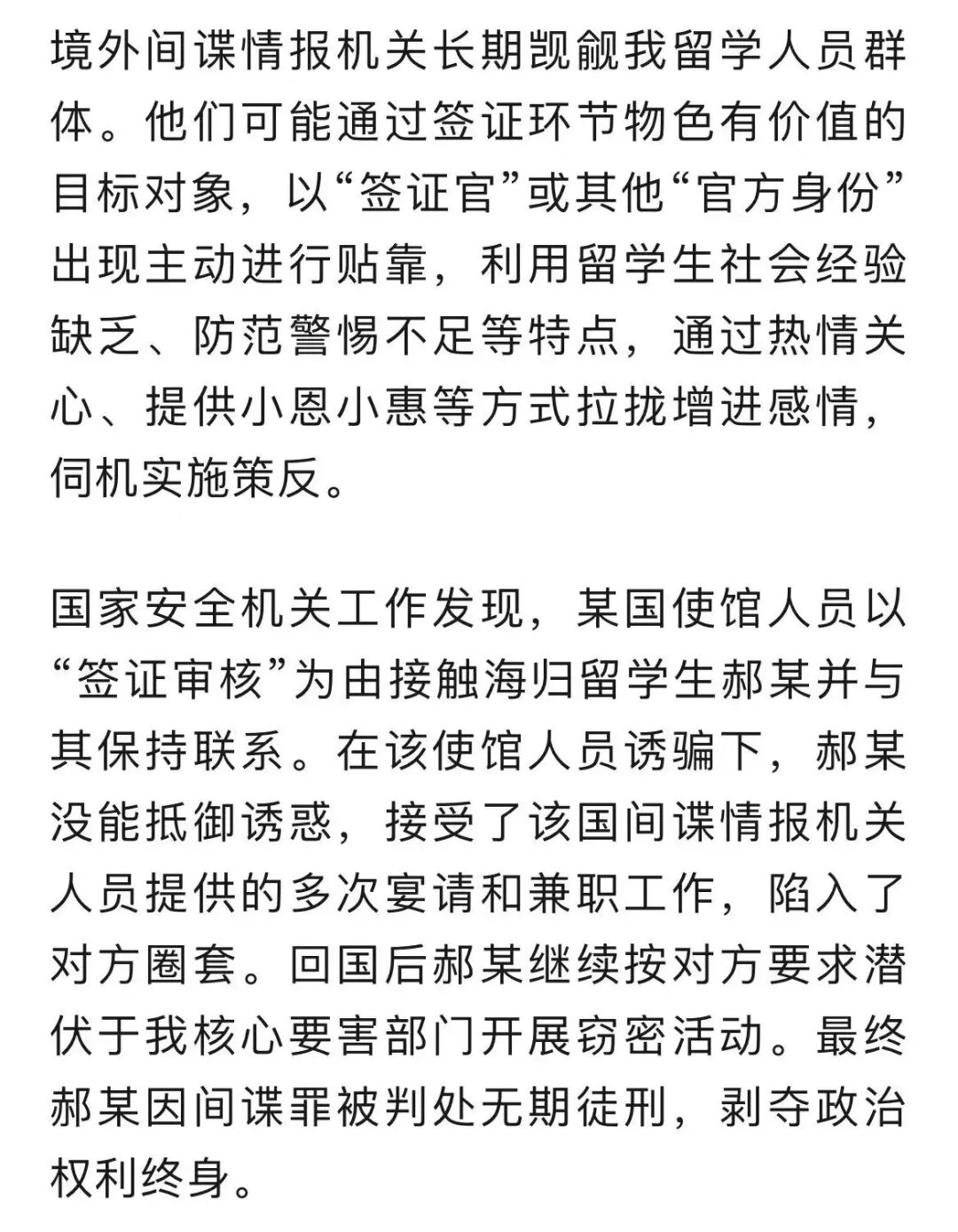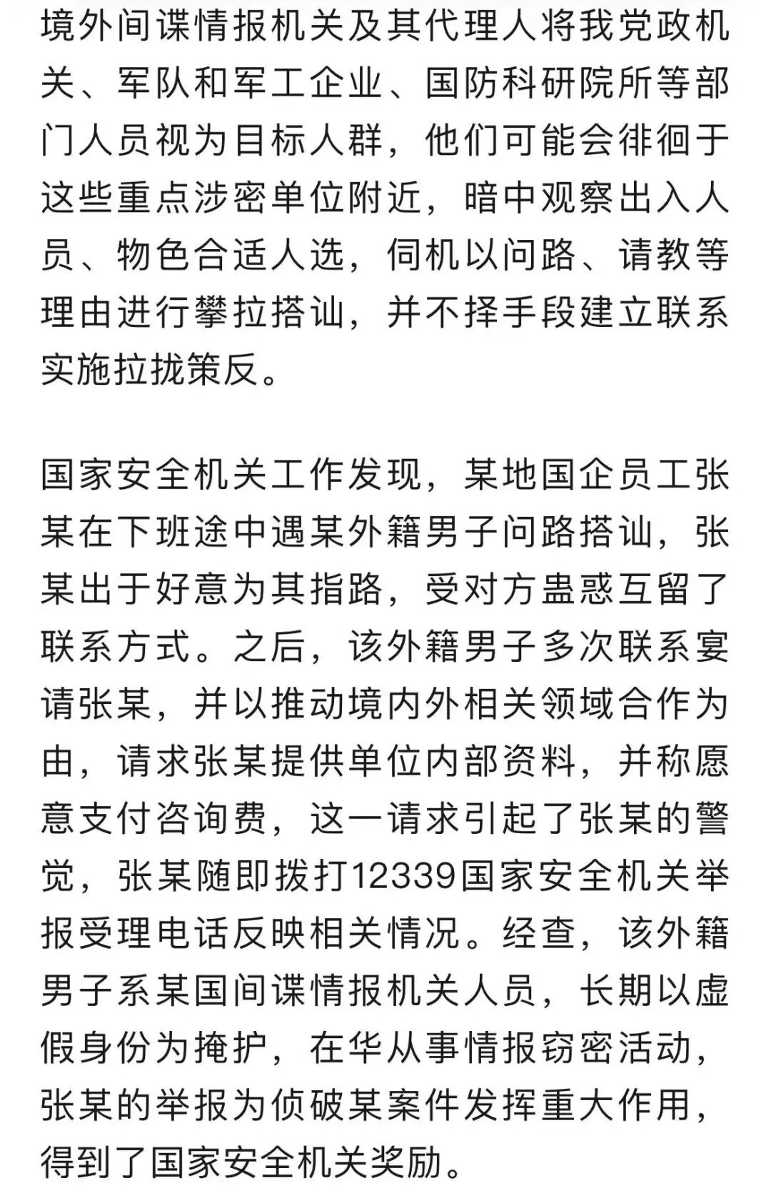 近年来,境外间谍情报机关紧盯我党政机关、国防军工、科研机构、高等院校及驻外机构等工作人员,以各种卑劣手段实施拉拢策反,危害我国家安全。近日,国家安全部官方发布多起案例,揭露一些间谍常用“套路”。 反间防谍 需要全社会的共同努力 每个人都是国家安全的守护者 提醒大家一定要擦亮双眼 常敲警钟。提高反间防谍意识,坚决抵制境外间谍情报机关窃密渗透破坏活动,严格遵守相关法律法规,杜绝侥幸心理,共同筑牢国家安全人民防线。 谨言慎行。广大人民群众特别是重点岗位工作人员应牢记纪律无小事、交友有规矩,保持高尚道德情操和健康生活情趣,主动净化社交圈、生活圈、朋友圈,做到慎独慎友,坚决不给境外间谍情报机关人员或别有用心之人任何可乘之机。 迷途知返。《反间谍法》规定,实施间谍行为,有自首或者立功表现的,可以从轻、减轻或者免除处罚;有重大立功表现的,给予奖励。在境外受胁迫或者受诱骗参加间谍组织、敌对组织,从事危害中华人民共和国国家安全的活动,及时向中华人民共和国驻外机构如实说明情况,或者入境后直接或者通过所在单位及时向国家安全机关如实说明情况,并有悔改表现的,可以不予追究。 国家安全,人人有责 广大人民群众 如发现有关可疑线索 可拨打12339进行举报 或向当地国家安全机关进行举报