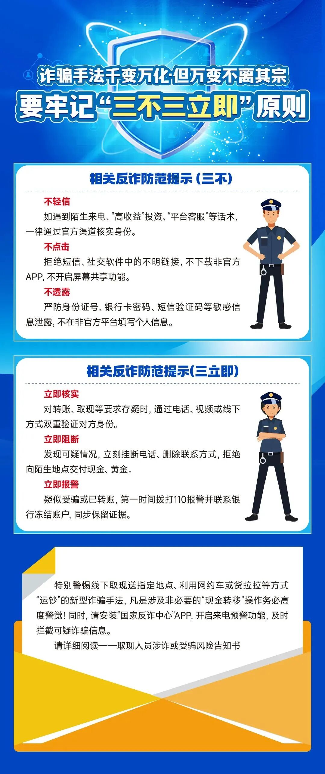 当前电信网络诈骗案件高发,给人民群众带来巨大财产损失,为避免市民朋友遭受损失或成为“电诈工具人”被追究法律责任,公安机关现就涉诈取现风险提示如下: