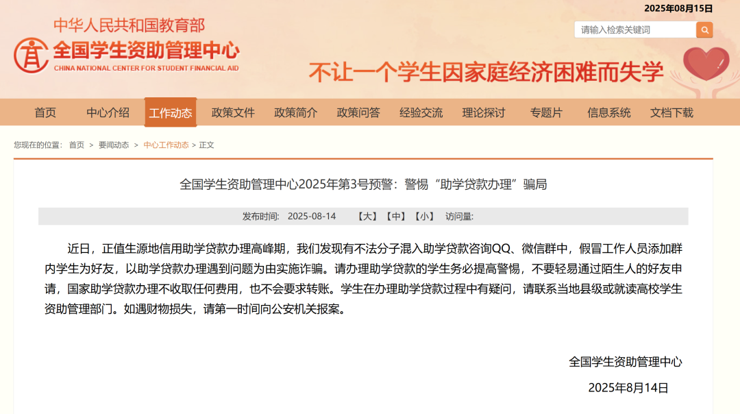 近期,全国学生资助管理中心 发布了2025年第3号预警 提醒同学们警惕“助学贷款办理”骗局 我们一起来看看 近日,正值生源地信用助学贷款办理高峰期,有不法分子混入助学贷款咨询QQ、微信群中,假冒工作人员添加群内学生为好友,以助学贷款办理遇到问题为由实施诈骗。 请办理助学贷款的学生务必提高警惕,不要轻易通过陌生人的好友申请,国家助学贷款办理不收取任何费用,也不会要求转账。学生在办理助学贷款过程中有疑问,请联系当地县级或就读高校学生资助管理部门。如遇财物损失,请第一时间向公安机关报案。 每年开学季 面对家长、学生的诈骗套路层出不穷 下面这份《开学季反诈指南》 请广大师生、家长查收学习 提高防骗能力 以免上当受骗 警方提醒 1.不轻易点击不明链接:无论是短信、邮件还是社交软件中收到的链接,只要来源不明,一律不要点击。这些链接可能隐藏着恶意软件,会窃取你的个人信息,或者将你引导至虚假网站,实施诈骗。 2.不扫描不明二维码:二维码背后可能暗藏玄机,随意扫描可能导致手机中毒、个人信息泄露,甚至直接造成财产损失。在扫描二维码前,一定要确认其来源可靠,是正规商家、机构提供的。 3.不向陌生账号转账:这是最重要的一点!无论对方以何种理由要求你转账,只要是陌生账号,坚决拒绝。在转账前,务必核实对方身份,通过电话、视频通话等方式与对方确认。 4.保护好个人信息:身份证号、银行卡号、密码、验证码等个人信息,是你财产安全的重要保障,绝不能随意透露给他人。在网上填写个人信息时,要选择正规、安全的平台,避免在不可信的网站或 APP 上留下个人信息。 5.及时与校方或家长沟通核实:如果接到涉及学校事务、孩子情况的电话或信息,不确定真假时,第一时间与校方或家长联系,核实信息的真实性。不要仅凭对方的一面之词就做出决定。