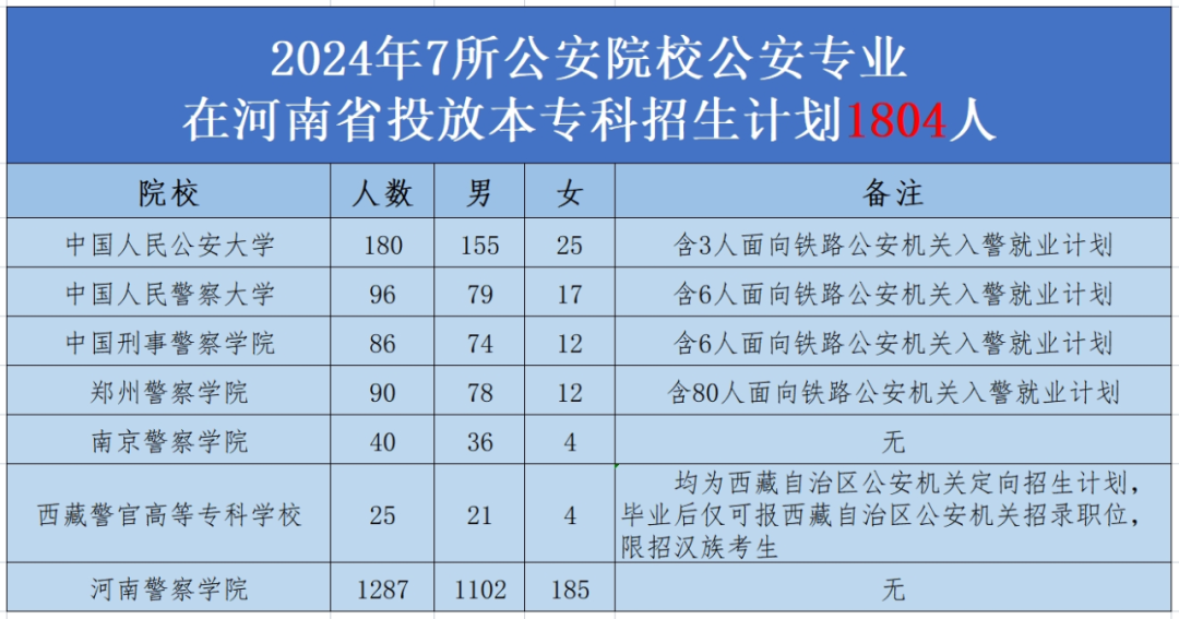2024年,中国人民公安大学、中国人民警察大学、中国刑事警察学院、郑州警察学院、南京警察学院、西藏警官高等专科学校和河南警察学院等7所公安院校公安专业在我省投放本专科招生计划1804人。