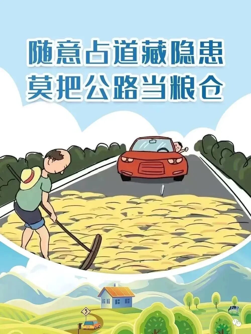 公路晒粮 历来都是一个老大难的问题! 又是一年小麦收割季 农村大大小小的马路 又快成了天然马路晒谷场! 这种晾晒方式 不仅占用了路面资源 影响交通 也极易引发交通事故 成为“夺命麦场” 害人又害己 占道晒粮危害大 积极劝导保安全 每年因为晒麦出的交通事故太多了 ▼ 晒粮不注意,被撞身亡 ▼ 老太太晒粮占用机动车道,司机驾车接电话不慎将其撞飞身亡。老太太承担一定责任。 麦秸秆打滑,骑车女子被撞飞身亡 ▼ 男子在乡道上晒麦秸秆,宝马车侧滑撞飞骑电动车女子,致其当场身亡。交警判责,晒麦秸秆者负主要责任。 公路晒粮出事故,晒麦者被判赔5万 ▼ 2016年6月2日,马某在自家门前的县道上晒小麦。谢某驾驶三轮载货摩托车经过该路段,由于小麦打滑,加之车速较快,随后撞上同向骑电动自行车的王某,致王某倒地,身上多处受伤,电动自行车损坏。交警到达现场后发现,谢某未取得机动车驾驶证,三轮摩托车亦未投保交强险,遂认定,谢某对此次事故负主要责任,马某负次要责任,王某无责任。王某住院花费11.2万元,后因赔偿问题,三方未能达成一致意见。王某将谢某、马某及县交通运输局告上法庭,索赔医药费、误工费、伤残赔偿金等17.5万元。 最后,法院综合此次事故发生的原因及各方的违法行为、过错程度及其与损害后果之间的原因大小等因素,判决谢某承担60%的赔偿责任,马某承担30%的赔偿责任(5万多元),交通运输局承担10%的赔偿责任。 1、严重影响正常的交通通行秩序 法律链接 在此提醒各位父老乡亲 为了自己和他人的生命安全 请勿占用道路打场晒粮 如遇有晒麦子的地方 小心慢行 小心慢行 小心慢行 让我们过一个安全祥和的收获季节!