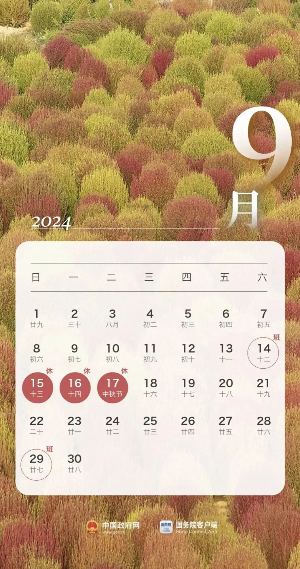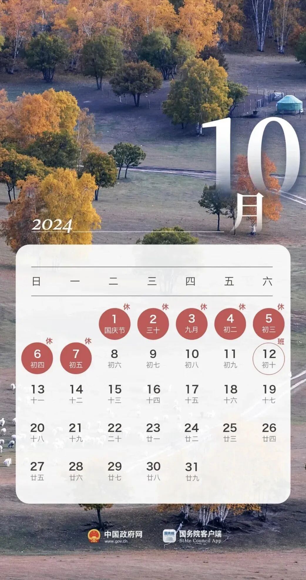 好消息来了马上我们就要迎来假期了!↓↓↓放假!共休10天! 中秋节 9月15日至9月17日放假调休,共3天9月14日(星期六)上班 国庆节 10月1日至10月7日放假调休,共7天9月29日(星期日)10月12日(星期六)上班也就是说中秋+国庆共有10天假可休!这么一想是不是搬砖都有动力了鼓足劲,干起来吧