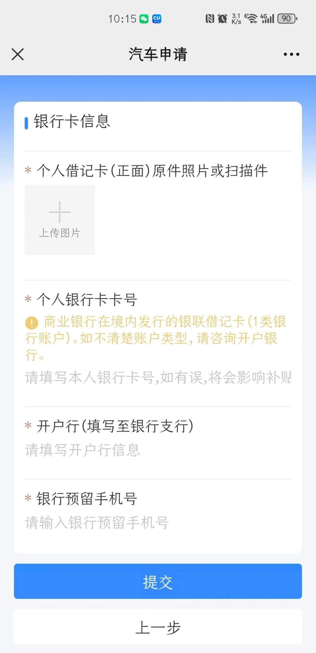 具体步骤如下 进入小程序后,选择“河南省汽车置换补贴申请”。 汽车报废换新与汽车置换补贴只能参与其中一个,不可重复。 消费者在购车后,需按照实际新购买车辆类型,进行新能源活动申请或燃油车活动申请选择。 特别提醒: ① 请核对车辆类型是否为您新购车辆类型。 ② 需上传新购车申请人身份证正面照片、身份背面照片,证件拍照清晰且四角露出。 上传完新车证件后,请核对相关信息是否与证件一致,如不一致请修改。 特别提醒: ① 请核验系统识别买方身份证号码、新车车牌号、买方姓名、新车价税合计、新车不含税、发票号码、发票代码、开票日期、新车注册日期、新车车辆类型、新车燃油种类是否正确,如识别错误,请修改。 ② 新车销售发票开具地请按发票开具市区/县进行选择。 上传完旧车证件照片后,请核对相关信息是否与证件一致,如不一致请修改。 特别提醒: 请核验系统识别卖方姓名、旧车价税合计、卖方身份证号码、旧车车牌号、旧车车辆类型、旧车燃油种类、旧车车辆识别代码(VIN码)、旧车在本人名下注册登记日期、旧车转让《二手车销售统一发票》开票日期是否正确,如识别错误,请修改。 银行卡信息上传填写阶段 需先上传商业银行在境内发行的银联借记卡(1类银行账户)正面照片,再填写开户行与银行预留手机号。 特别提醒: ① 请与发卡行联系,确定申领补贴银行卡为1类银行卡账号。 ② 请与开户行联系,确定开户行信息,填写至银行支行。 ③ 银行卡需本人银行卡,请反复核对卡号、开户行、银行预留手机号信息 来 源:河南发布