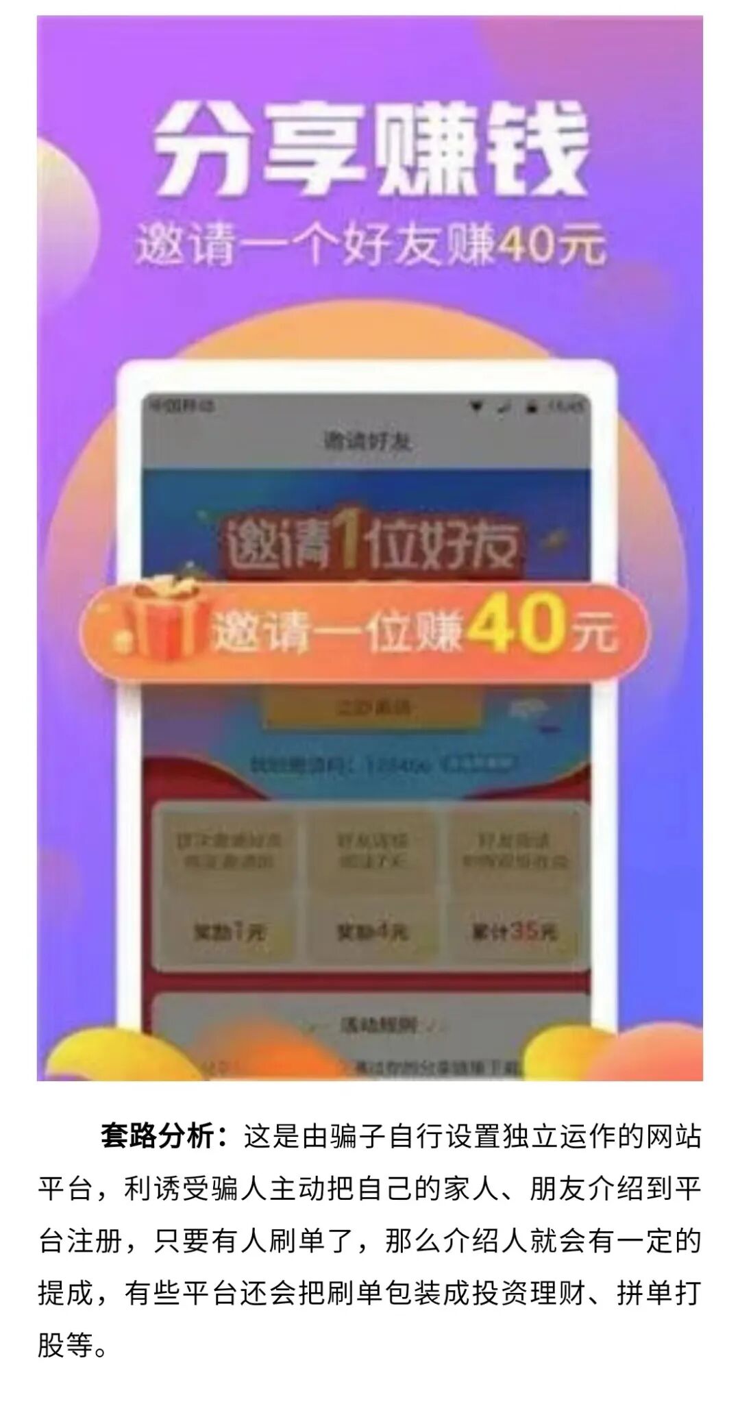 “刷单”是什么意思?刷单就是诈骗吗?在被骗受害者中,99%的人不知道答案百科:刷单刷单是一个电商衍生词,指的是商家付款请人假扮顾客购买店铺商品,用这种虚假销售业绩提高网店的排名和销量获取销量及好评获得购物平台权重等级,来提高自己的搜索排名,获得更多的流量,吸引更多顾客。刷单行为本身就是欺诈行为。2016年3月15日,央视3·15晚会首次曝光了网购刷单内幕。百科:刷单诈骗刷单诈骗,最先以刷单兼职诈骗的形式出现,是指骗子通过网络途径发布以“零投入、高回报、日清日结”为噱头的刷单兼职信息,通过头几次刷单后立即返还本金、佣金骗取事主信任后,诱导其加大本金投入,随后以打包任务未完成等理由拒不返款,最终将事主拉黑。刷单诈骗,最明显、最稳定的特征就是:早期小投入、能返利,意乱情迷,获利实实在在;后期大投入、被拉黑,血本无归,损失真真切切。(网络图)任务具体是什么呢?准备好! 真正的“任务”来了 刚开始大家都在观望但重赏之下必有勇夫一千,三千,五万......你心动不?然而事实是群里面 除了你都是骗子 但是等你开始做的时候套路可就不一样了你按照要求开始操作结果被告知 “操作失误” 而且只有你和另一个人错了正当你为“赚钱之路”受到阻碍而苦恼时对方会“贴心地”告诉你再“补单”三万块钱 你可以赚到更多 这时你就该清醒了 和你一起出错的也是个骗子 此时的骗子依然没有放弃你他会迅速假装按要求重新操作后 钱到账了 当然这些都是做给你看的如果你信以为真那么三万块钱就到了骗子账户之后你还会发现三万之后还有三万、六万、九万直到你被骗得一无所有才发现 群里刷单刷得最猛的也是个骗子 当骗子意识到你已经醒悟就会立马将你 踢出群聊 也有一些会对你进行洗脑、忽悠、恐吓要求你借款、贷款继续任务血淋淋的刷单被骗案看完你还敢继续刷吗?你以为自己很聪明总是想着“我怎么可能会被骗”“看我怎么从骗子手里骗点钱”殊不知你掉进了一个“骗子窝”一个诈骗团伙骗你一个人高端的猎手往往会以猎物的形式出现你以为不会上当并且全身而退?醒醒吧!!!