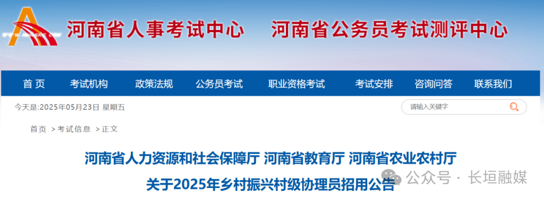 2025年5月22日河南省人力资源和社会保障厅、河南省教育厅、河南省农业农村厅联合发布招用公告。网址: