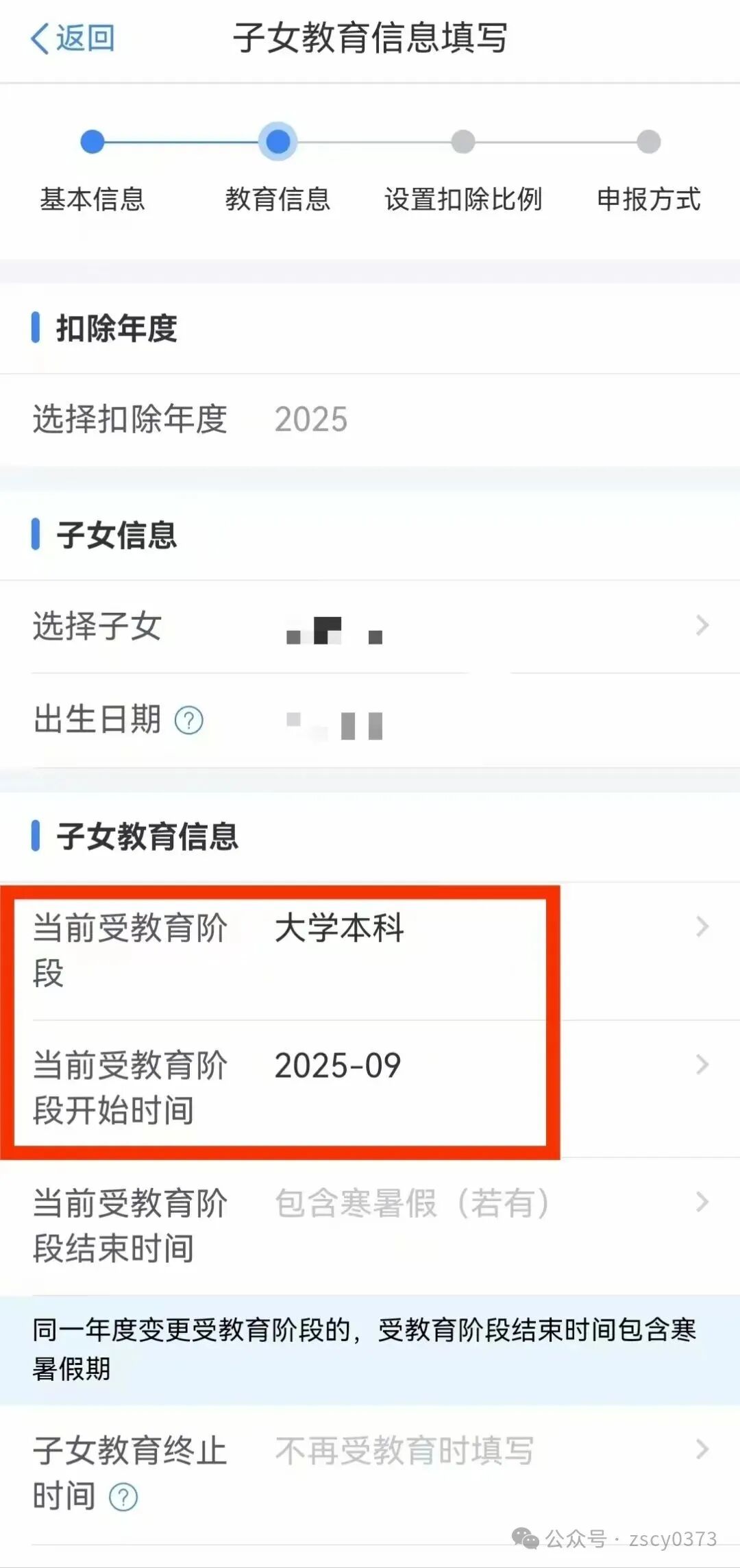 答:需要。子女由幼儿园升入小学、初中升入高中、高中升入大学专科/本科、后续升入硕士研究生/博士研究生,都属于教育阶段发生变化的情况。如果信息未及时更新,系统可能无法准确识别孩子当前的教育阶段,可能导致您在孩子上大学后,无法及时享受每月2000元的税前扣除优惠。 建议您在8月底、孩子大学入学前完成修改。这样能确保从9月份(孩子入学当月)开始,您的个税扣除无缝衔接。 答:孩子由高中阶段教育进入大学本科阶段,子女的教育阶段发生变化,这种情况要在原有的子女教育专项附加扣除信息基础上新增一条信息。您可以通过个税App进行操作: 1. 登录个税App,点击下方“办&查”一专项附加扣除一子女教育一选择查询扣除年度。 2. 选择子女后,新增一条子女教育信息:【当前受教育阶段】选择“大学本科/大学专科”,并填写具体信息。【当前受教育阶段开始时间】填写大学入学年月。【当前受教育阶段结束时间】填写预计的子女大学本科毕业时间,或暂不填,待毕业时再填报。 3. 选择“扣除比例”和“申报方式”。 温馨提示 请勿直接修改原有的子女教育专项附加扣除信息。例如直接将2025年1-8月的“高中阶段教育”修改为“大学本科”,这会导致高中数据被覆盖,无法享受对应阶段的专项附加扣除,所以一定要按上述步骤新增一条教育阶段信息。 操作完成后,您本年度的“子女教育”专项附加扣除会有两条记录,一条是“高中教育”阶段,另一条是“大学本科/大学专科”。